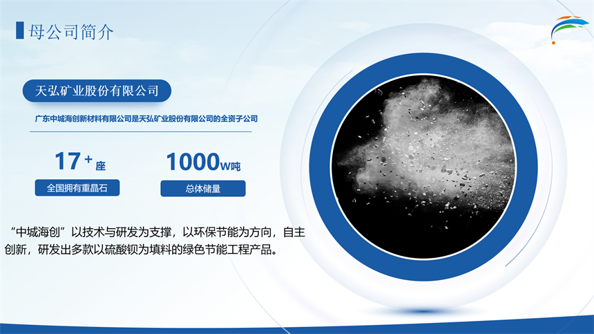 Guangdong Zhongchenghai Innovative Materials Co., LTD is an enterprise under Tianhong Mining, which focuses on the research and development of new materials, devotes itself to reducing energy consumption and creating healthy space, relying on the research and development team of the Inst itute of Geochemistry of the Chinese Academy of Sciences, the Research Institute of Building Materials Science of Western Construction of China, and the parent company (17 mines, 6 factories). Transforming radiation refrigeration, material phase change, barium sulfate and other cutting-edge technologies, the solution covers refrigeration/thermal insulation coatings (up to 30 degrees), thermal insulation felt (up to 50 degrees temperature difference between inside and outside objects), building glass refrigeration film, negative oxygen ion coatings and so on, which are applied in many fields such as construction, petrochemical industry, indoor coatings, etc., to make the sky bluer. Let people live and work in a comfortable and healthy space, and make the greatest contribution to the national goal of "double carbon" and "good house"!